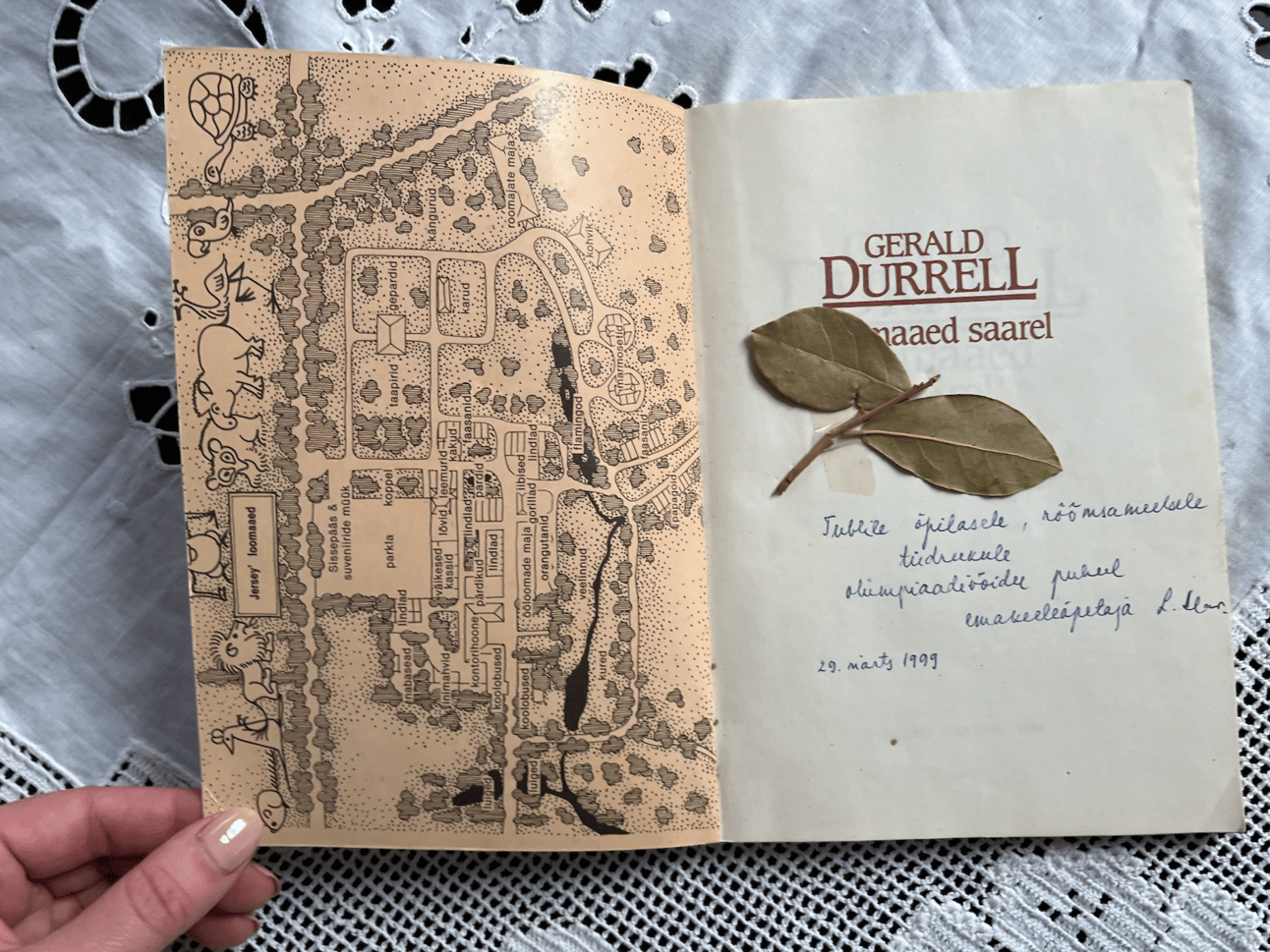 Ja lõpetuseks – eelmisel nädalal raamaturiiuleid sorteerides leidsin Gerald Durrelli raamatu “Loomaaed saarel”, mille seesama õpetaja mulle 6. klassis emakeeleolümpiaadil osalemise eest kinkis. Koos Kreekast toodud loorberioksaga. Selle raamatu sisekaanel on Jersey loomaaia kaart, mis tänasel päeval kannab Durrelli nime. Ma polnud pärast põhikooli lõppu seda raamatut vist isegi avanud. Aga nüüd, kui seda tegin, tundus korraga päris kummaline, et olen elus juba kahel korral Jerseyle ja sellesse loomaaeda sattunud (võin saata soovijaile kinnituseks fotosid leemuritest). Ning need reisid pole olnud sellest raamatust inspireeritud, need on aset leidnud hoopis teistel asjaoludel. Või olen jätkuvalt pisut naiivne selle osas, kuidas kirjandus tegelikult mu elu juhtinud on. Ja missugune võim on ühel heal kirjandusõpetajal.